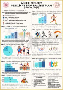 Gençlik ve Spor Bakanlığı 2024-2028 Stratejik Planı doğrultusunda; Valiliğimiz himaye ve koordinesinde, Gençlik ve Spor İl Müdürlüğümüz başta olmak üzere ilgili kamu kurum ve kuruluşları, yerel yönetimler, federasyon temsilcilikleri, spor kulüpleri ve sivil toplum kuruluşlarının katkılarıyla hazırlanan “Ağrı İli Gençlik ve Spor Faaliyet Planı” yürürlüğe girmiştir.