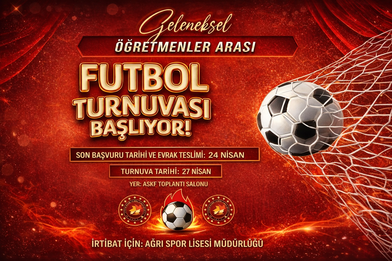 Ağrı İl Milli Eğitim Müdürlüğü ile Gençlik ve Spor İl Müdürlüğü iş birliğinde düzenlenen öğretmenler arası geleneksel futbol turnuvası, 27 Nisan’da başlayacak.