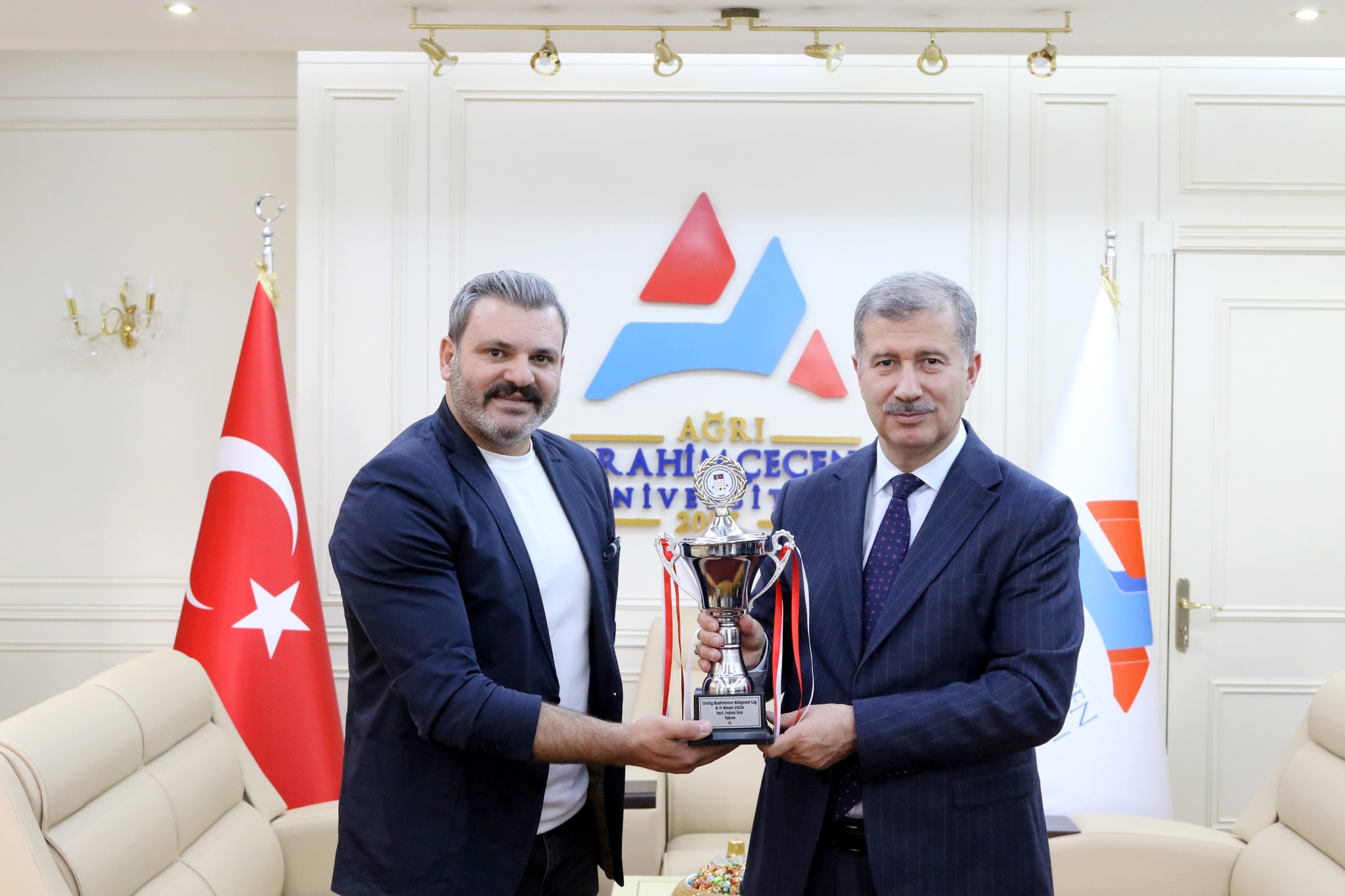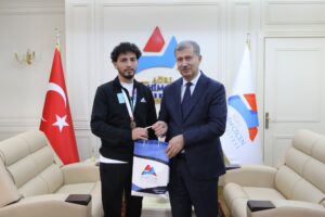 Ziyaret kapsamında, kazanılan kupa Doç. Dr. Serkan Tevabil Aka tarafından Rektör Prof. Dr. İlhami Gülçin’e takdim edildi.