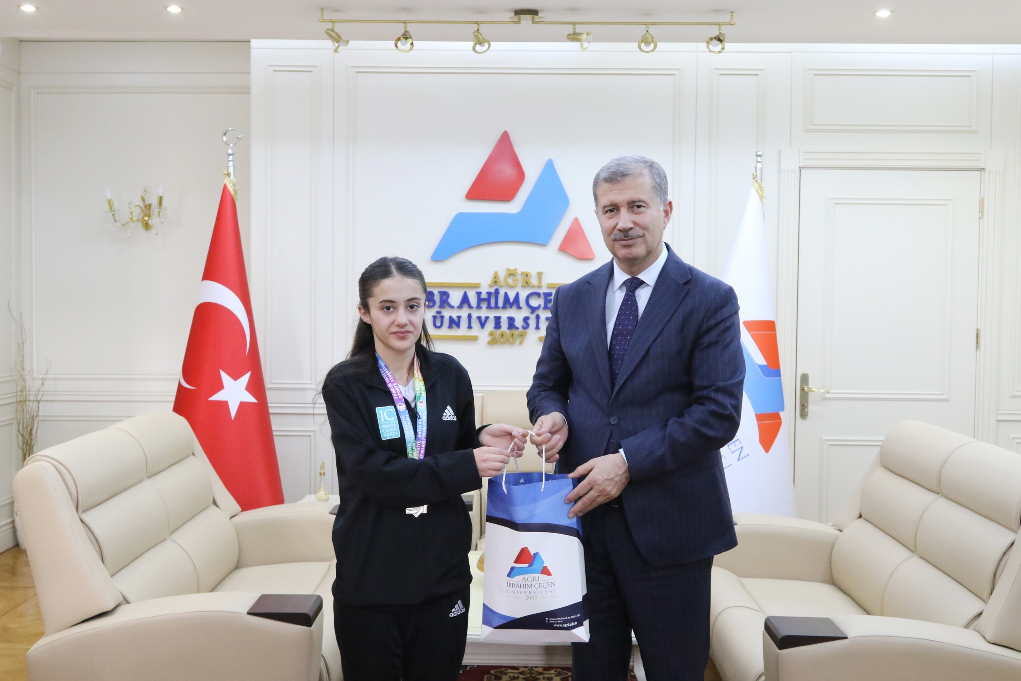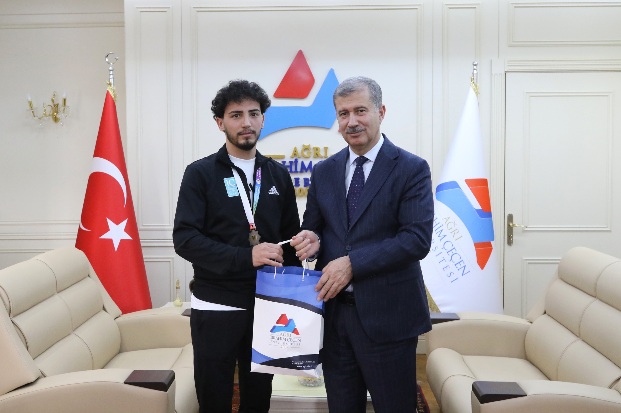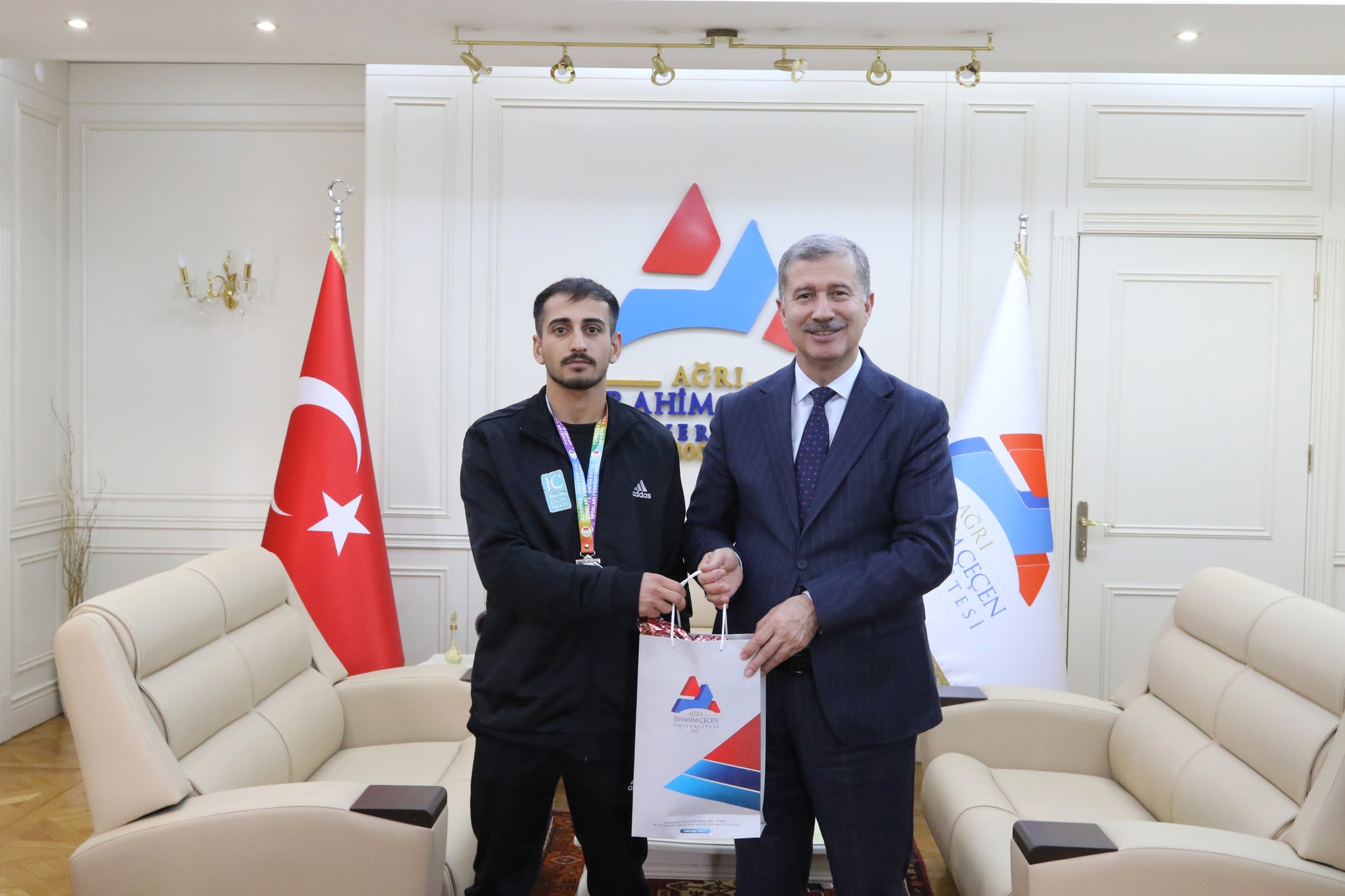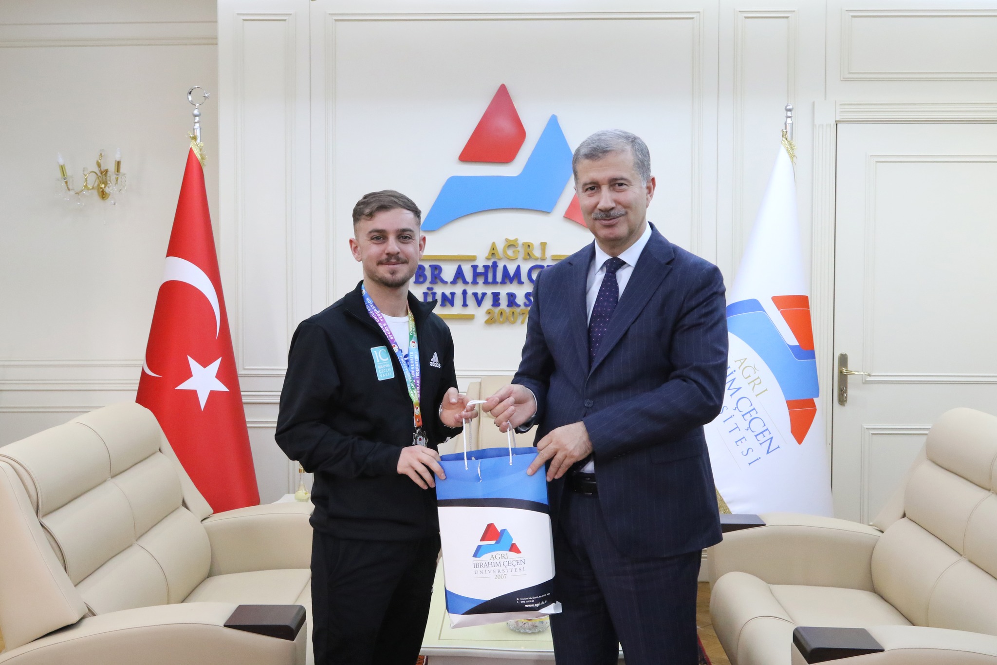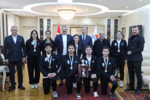 Ziyarette sporcularımız ve antrenörleri Doç. Dr. Serkan Tevabil Aka ile bir araya gelen Rektör Prof. Dr. İlhami Gülçin, elde edilen başarıdan duyduğu memnuniyeti dile getirerek, sporcularımızı ve teknik ekibi tebrik etti.