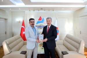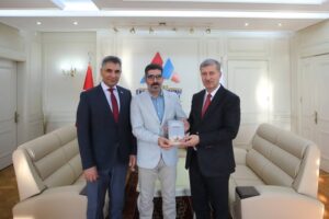 Rektör Prof. Dr. İlhami Gülçin, Fen Edebiyat Fakültesi öğretim üyesi Doç. Dr. Hakan Kaya’yı makamında kabul etti, Ziyarette, Doç. Dr. Kaya, Rektörümüz Prof. Dr. İlhami Gülçin’e yeni yayımlanan ‘BAYEZİD’ adlı kitabını takdim ederek bilgi veri.