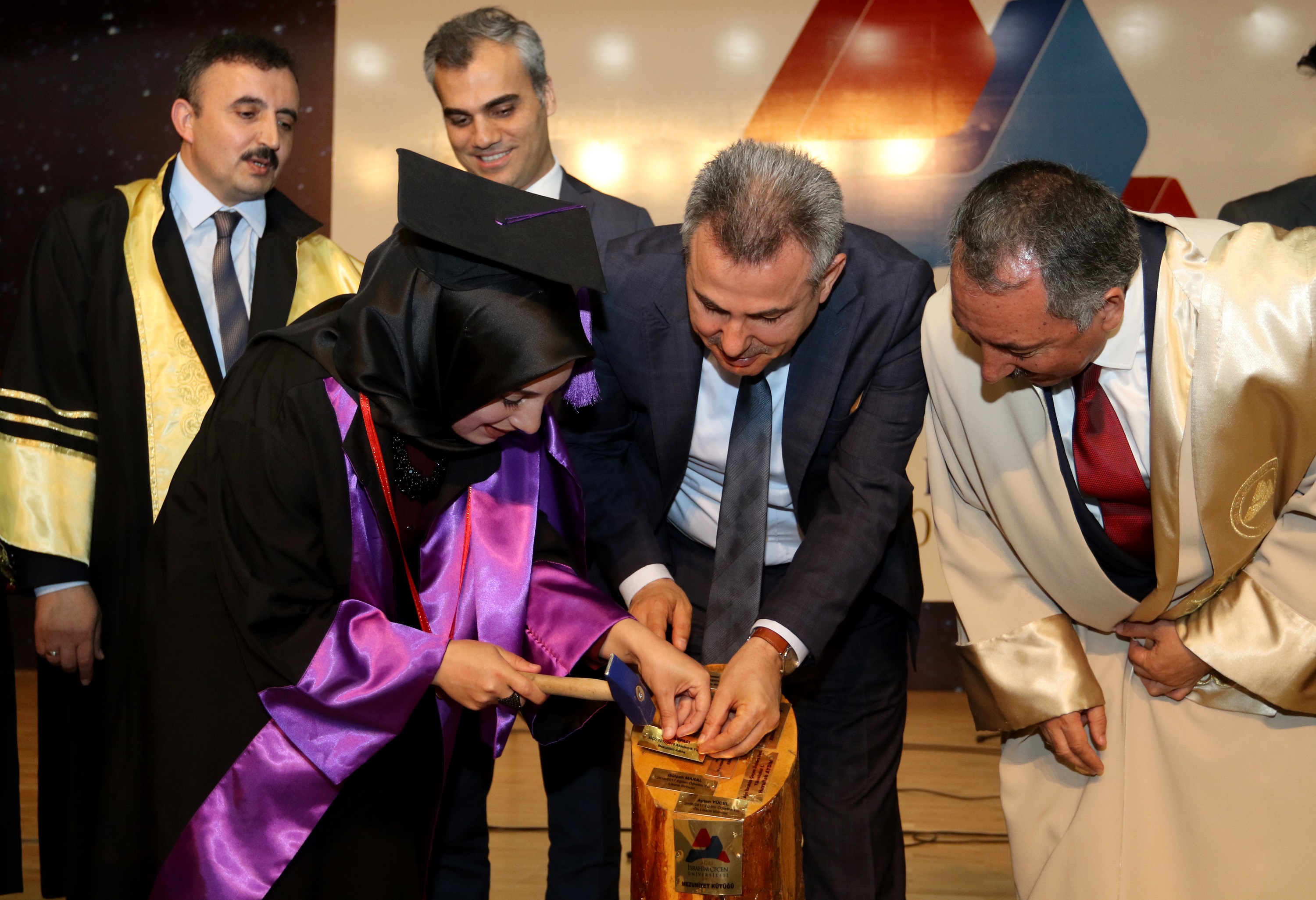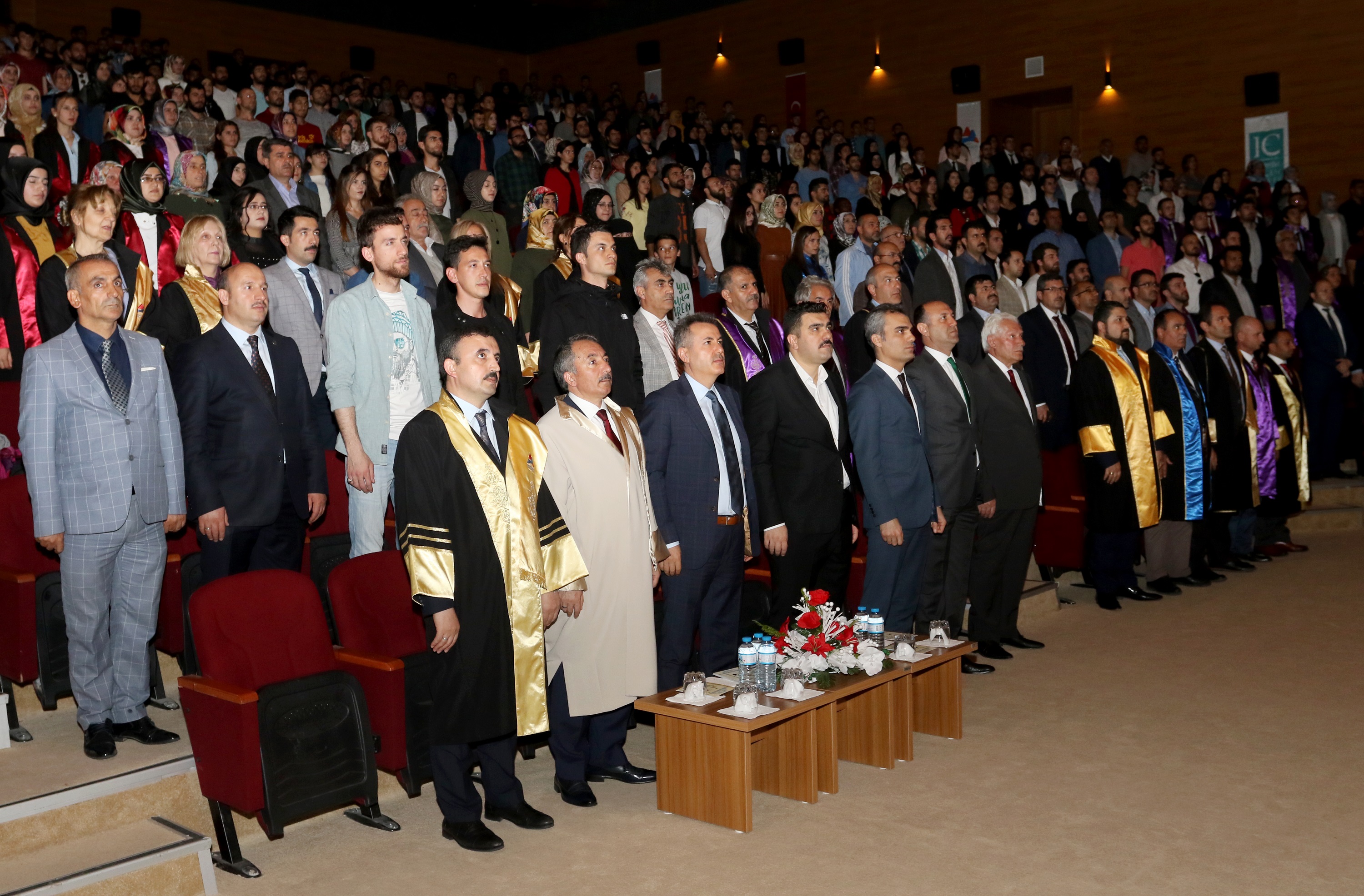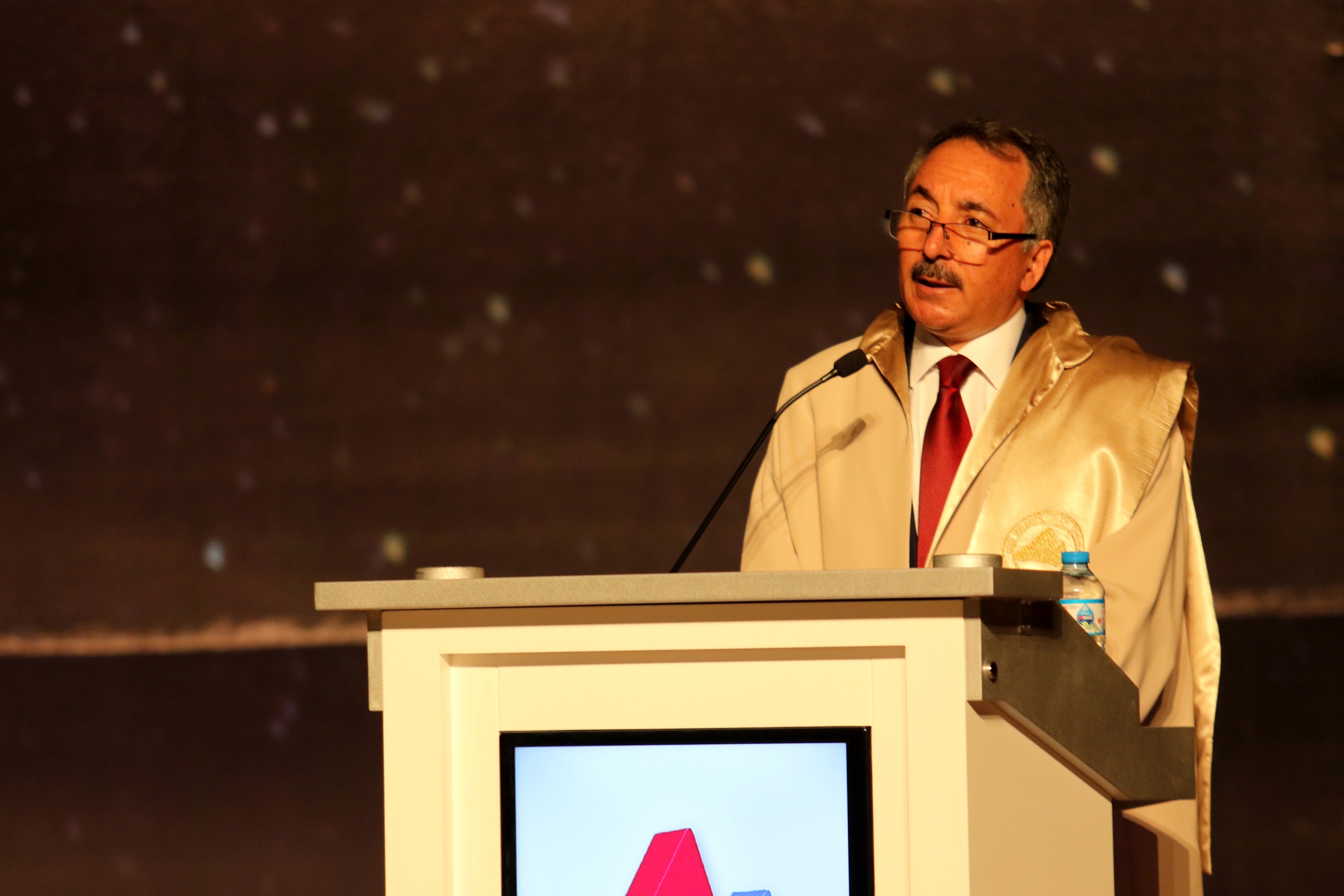 Törende konuşan Rektör Prof. Dr. Abdulhalik KARABULUT, “2017-2018 eğitim öğretim yılı üniversitemiz için her anlamda çok başarılı bir yıl oldu; emeği geçen, katkısı bulunan tüm akademik ve idari kadromuza, öğrencilerimize, destekçilerimize teşekkürlerimi sunarım.” dedi. Üniversite eğitimini nesiller arası bir randevu olarak gördüklerini söyleyen Prof. Dr. KARABULUT sözlerine şu şekilde devam etti; “Sizler yarının düşünce önderleri, iş dünyasının liderleri, eğitimcileri, bilim insanları ve sanatçılarısınız; kısacası siz yarınımızın sahipleri ve ülkemizin geleceğisiniz. Sadece başarı ve sonuç odaklı değil, aynı zamanda insan odaklı olun. Daima pozitif, yapıcı ve mütevazı olun. Hayatta ne ile karşılaşırsanız karşılaşın, heves ve heyecanınızı sakın ola ki kaybetmeyin. Unutmayın ki, her bireyin içinde yaşadığı topluma yapabileceği en güzel katkı, kendi içindeki heves ve heyecanı en iyi şekilde yaşamasıdır. Sadece size gösterilen yollardan yürümeyin; aynı zamanda kendi yol ve patikalarınızı oluşturun ki, başkaları da o yeni yollardan ve patikalardan yürüyebilsin. Ancak gönülden sevdiğiniz işlerde başarılı olabilirsiniz. Dolayısı ile ülkenize ve insanlığa katkınız da en çok ve en iyi olur. Gördüğünüz hataları ve eksiklikleri, yeni şeyler öğrenmek için fırsatlar olarak değerlendirin. Sizleri unutmayacağız, sizleri hep özleyeceğiz ve biz sizlerin başarılarını hep alkışlıyor olacağız. Tüm yaşamınızın sağlık, mutluluk ve başarı ile dolu olmasını dilerim.”