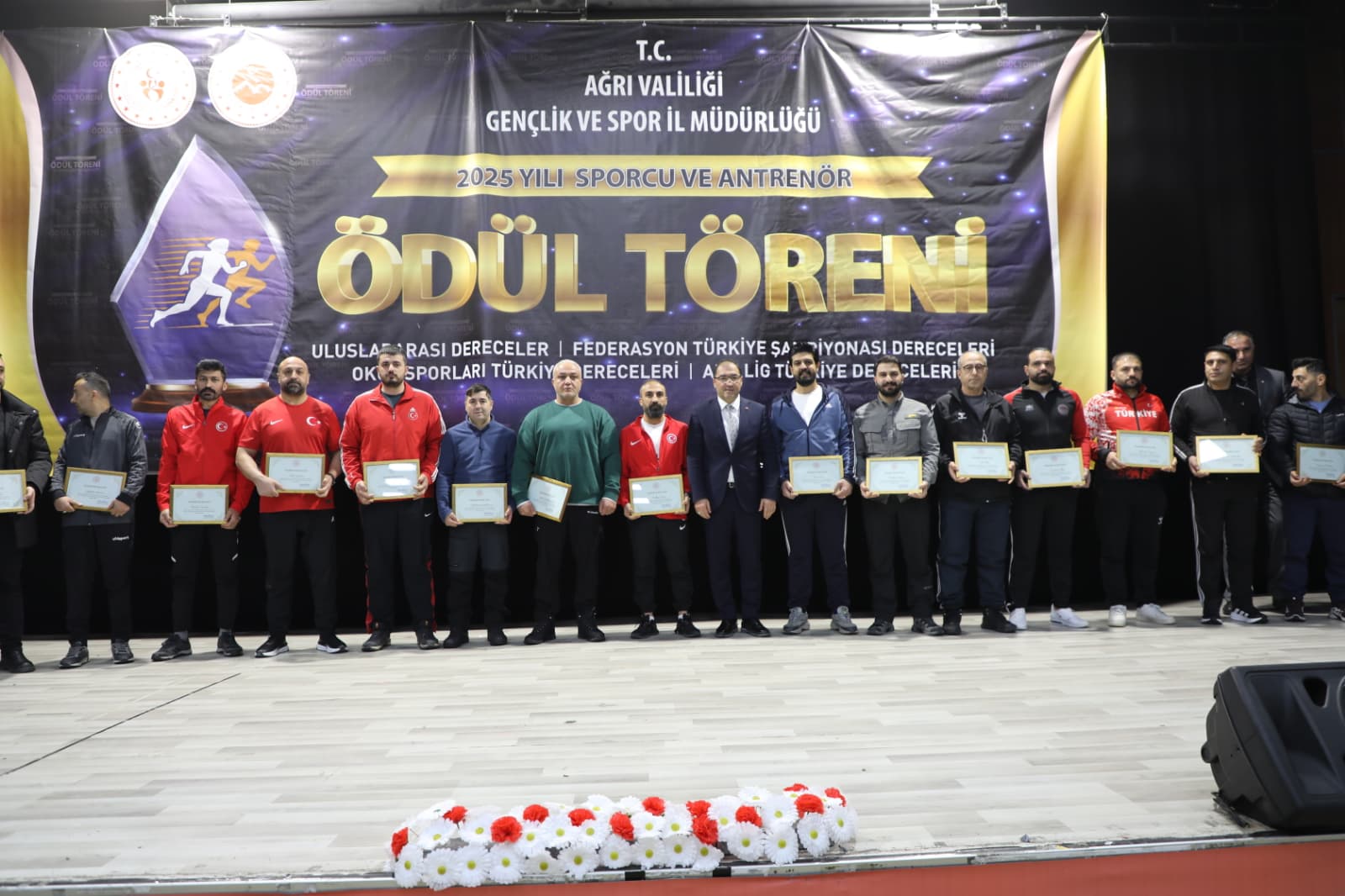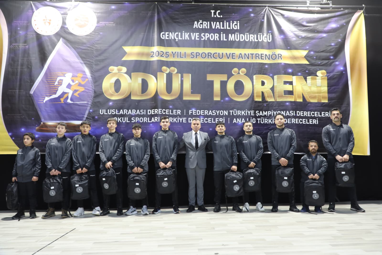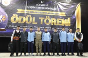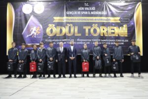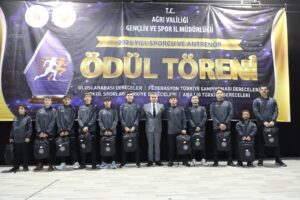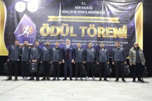 Ağrı Gençlik ve Spor İl Müdürlüğü tarafından düzenlenen “2025 Yılı Sporcu ve Antrenör Ödül Töreni”, Kültür ve Kongre Merkezi’nde görkemli bir programla gerçekleştirildi. Ağrı’yı ulusal ve uluslararası müsabakalarda başarıyla temsil eden sporcular ile bu başarıların mimarı olan antrenörler, düzenlenen özel gecede bir araya geldi. Şehrin spor potansiyelini ve başarılarını taçlandırmak amacıyla düzenlenen törene; Ağrı Valisi Mustafa Koç, Cumhuriyet Başsavcısı Adem Çalış, Ağrı Barosu Başkanı Avukat Serdar Günakın, Rektör Yardımcısı Prof. Dr. Yakup Karataş, Vali Yardımcısı Tuncay Karataş, siyasi parti il başkanları, kurum müdürleri, spor camiası, sporcu aileleri ve çok sayıda davetli katıldı.