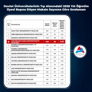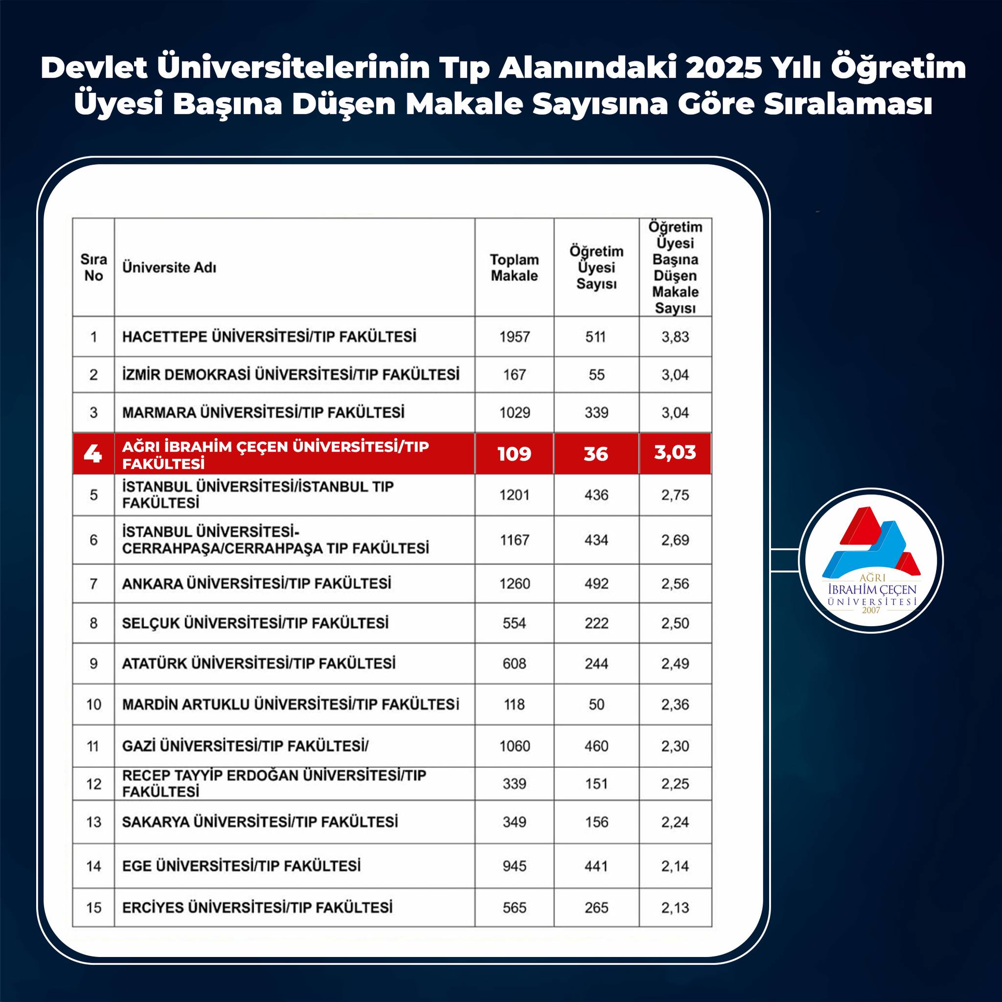 Ağrı İbrahim Çeçen Üniversitesi (AİÇÜ) Tıp Fakültesi, 2025 yılı için Scopus’ta indekslenen tıp alanındaki yayınlar ile Yüksek Öğretim Kurulu (YÖK) veri tabanındaki öğretim üyesi sayıları esas alınarak yapılan değerlendirme sonucuna göre öğretim üyesi başına düşen 3,03 makale ortalaması ile Türkiye’de 4’üncü sırada yer aldı.