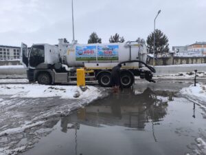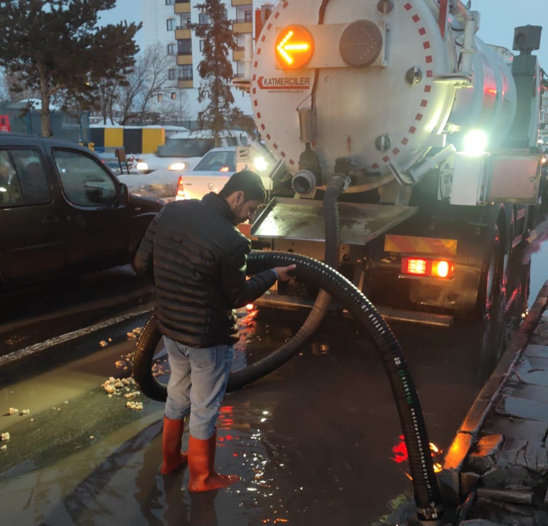 Yollarda ve kaldırım kenarlarında biriken kar sularının tahliyesi amacıyla vidanjörle müdahale edilirken, su birikintilerinin yurttaşların günlük yaşamını olumsuz etkilememesi için gerekli önlemler alınıyor.